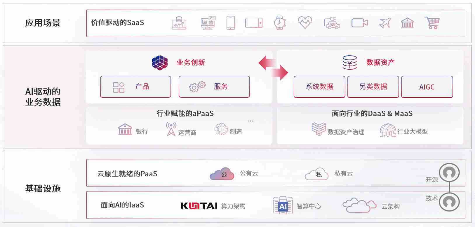 数字时代,,,,围绕企业数字化转型的关键要素,,,,3223.bet数码开创性的提出数云融合战略和技术体系框架,,,着力在云原生、、数字原生、、、AI原生和信创产业上架构产品和服务能力,,,为处在不同数字化转型阶段的快消零售、、、、汽车、、、金融、、、、医疗、、、、政企、、、、教育、、、、运营商等行业客户提供泛在的敏捷IT能力和融合的数据驱动能力,,,,构建跨界融合创新的数字业务场景和新业务模式,,助力企业级客户建立面向未来的核心能力和竞争优势,,,全面推动社会的数字化、、智能化转型升级。。。